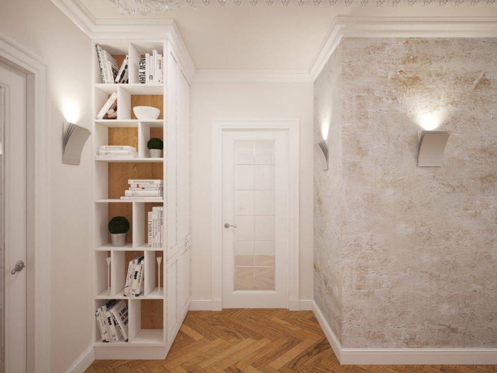Если места достаточно для шкафа-купе, с ним можно совместить зеркало. Наличие алькова дает пространство для вешалки или шкафчика для обуви. Картина, повешенная сверху, освещенная точечными светильниками, станет дополнительным элементом декора.