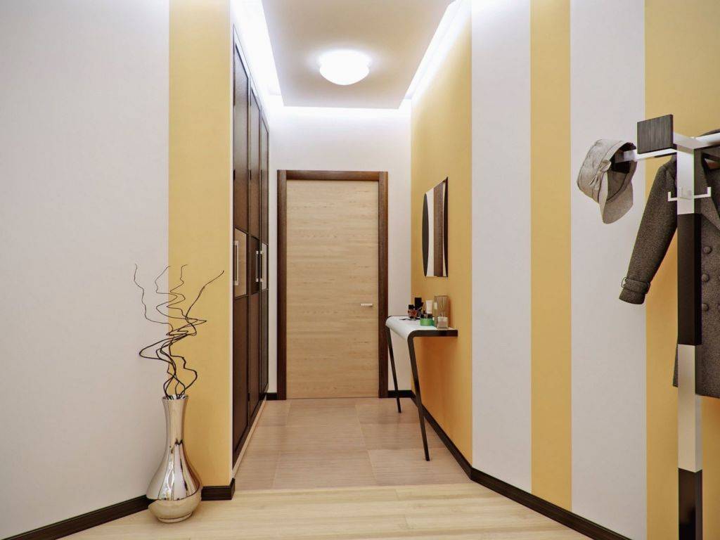 - Узкие длинные коридоры желательно оклеить виниловыми обоями с мелким рисунком, пустив по нижней части стены панели из МДФ под цвет мебели.