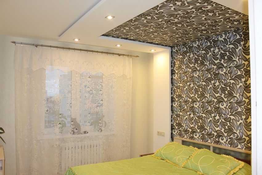 Бумажные обои скрывают существенные дефекты потолка, стоят дешево и не «крадут» лишнее пространство.