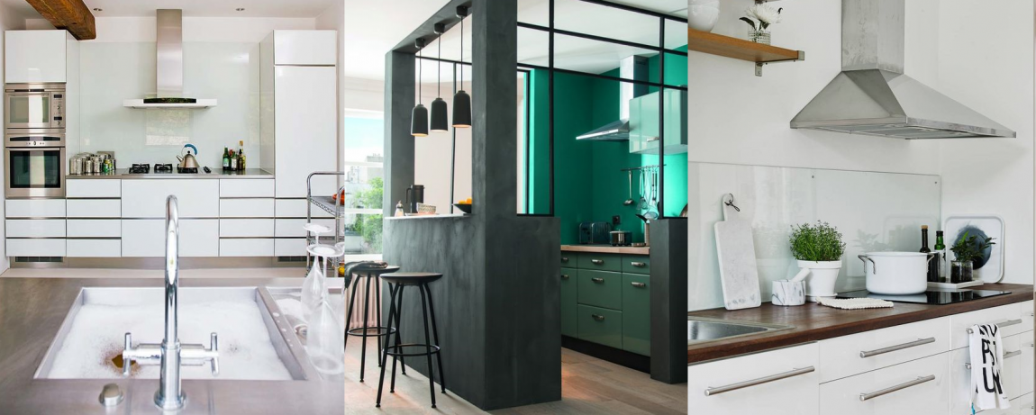 Стекло — еще один вариант материала для фартука. Применяется прозрачное или окрашенное стекло. В первом случае стекло выполняет защитную функцию: за ним, как правило, находятся обои или краска, которые стекло защищает от воды и жира.