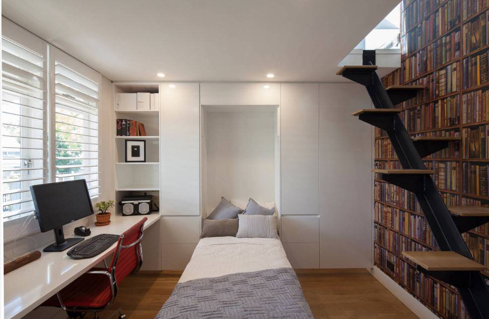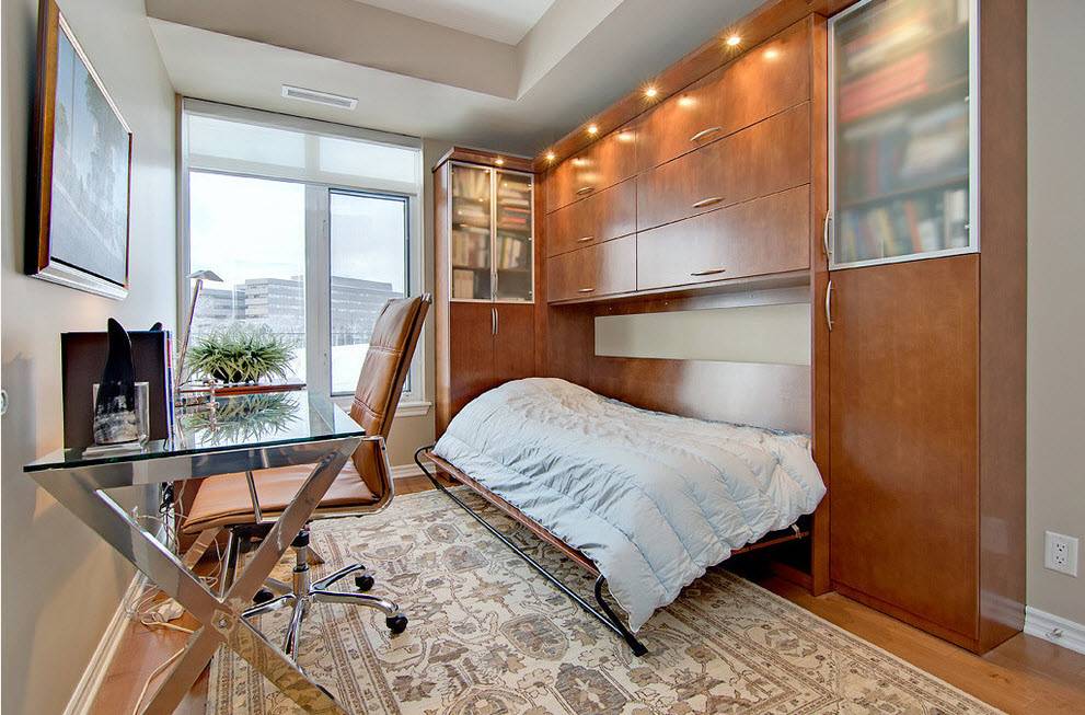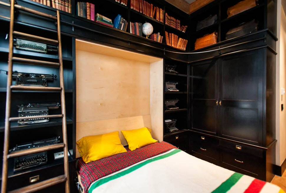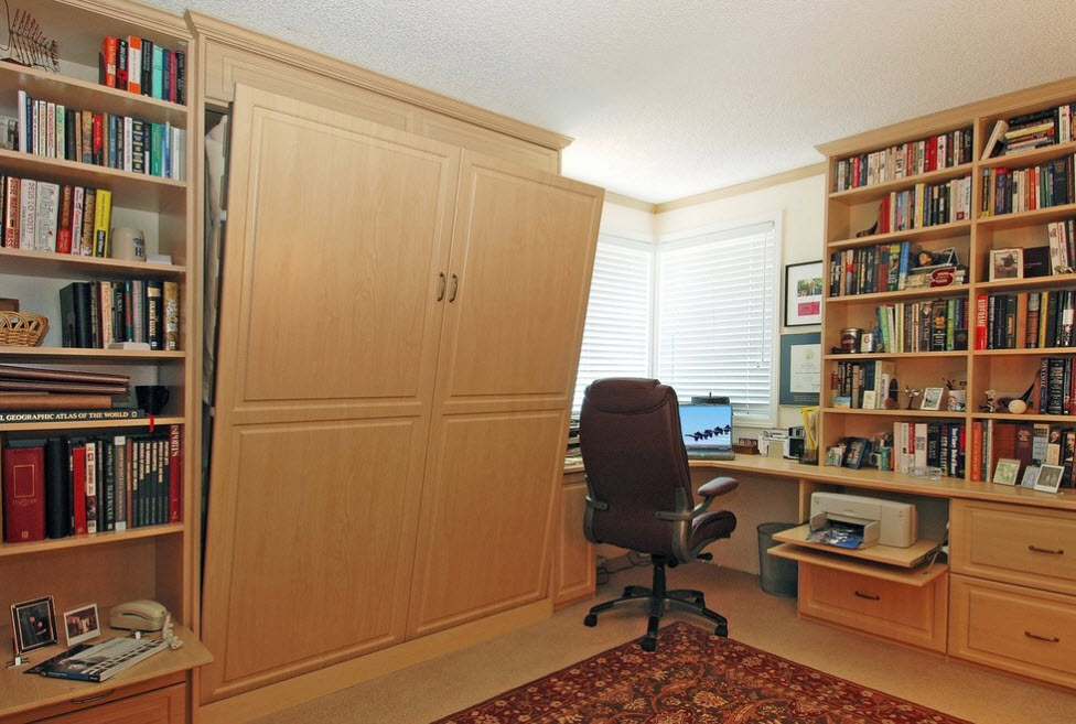 Офисная кровать, возможно, не самое популярное использование трансформируемой мебели в жилых помещениях, но она довольно распространена в очень просторных домах. Иногда при длительной работе удобнее переночевать в офисе, чем прийти в комнату, рискуя разбудить семью.