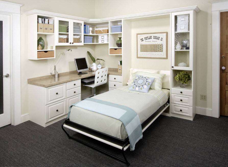 Отличный вариант объединить рабочую зону и спальню – приобрести кровать-стол. Удобный вариант для фрилансеров и людей с большим объемом работы. Поверхность стола при этом не нужно освобождать от техники и бумаг. Конструкцией предусмотрен разворот столешницы, поэтому все вещи останутся на месте. Стол-кровать может включать дополнительные ниши с полками или ящиками. Альтернативой может служить туалетный столик вместо рабочего.