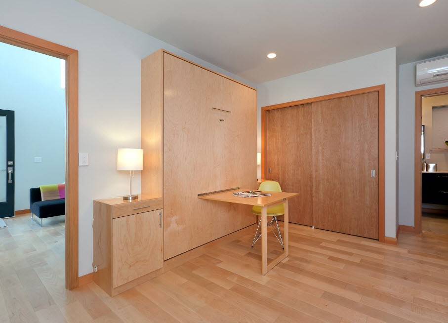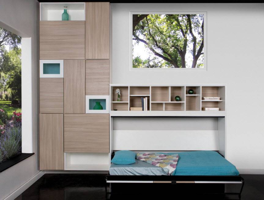 Откидная от стены кровать отлично спрячется в шкаф и сэкономит примерно 4 квадратных метра. При этом нижняя часть кровати маскируется под шкаф с ручками и ящиками, что позволяет полностью сымитировать и повторить дизайн всего гарнитура. И складная кровать ничем не отличается от стационарных кроватей. В другом варианте кровать в вертикальном положении закрывается раздвижными дверями, по типу шкафа-купе.