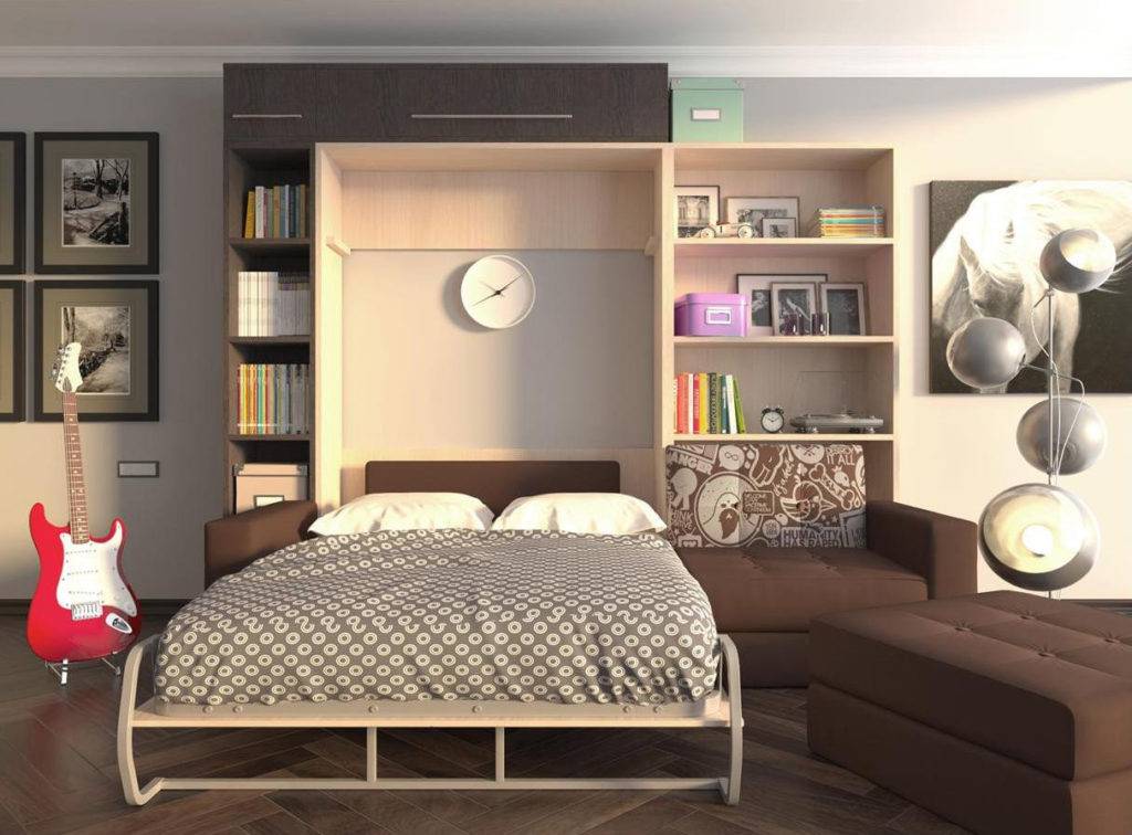 Откидная от стены кровать отлично спрячется в шкаф и сэкономит примерно 4 квадратных метра. При этом нижняя часть кровати маскируется под шкаф с ручками и ящиками, что позволяет полностью сымитировать и повторить дизайн всего гарнитура. И складная кровать ничем не отличается от стационарных кроватей. В другом варианте кровать в вертикальном положении закрывается раздвижными дверями, по типу шкафа-купе.