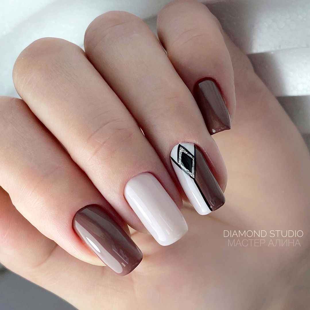Сочетание коричневого и белого цветов является наиболее популярным в дизайне ногтей. В таком маникюре коричневый — прекрасная альтернатива категоричному и не всегда уместному черному цвету. Очень нежно и нежно смотрится бело-коричневый маникюр. Нейл-арт можно делать как на коротких, так и на длинных ногтях.