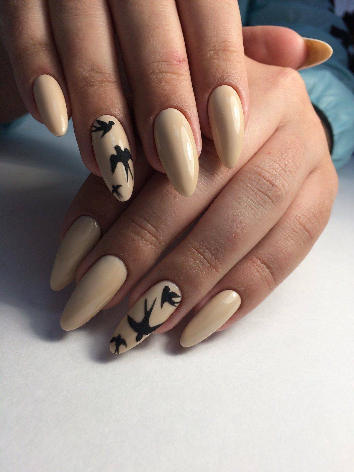 Любительницам стиля минимализм предлагаем обратить внимание на нейл-арт с нежными веточками, листочками, зверюшками, птицами. Модель лучше всего выполнять черным гель-лаком на светло-коричневом фоне