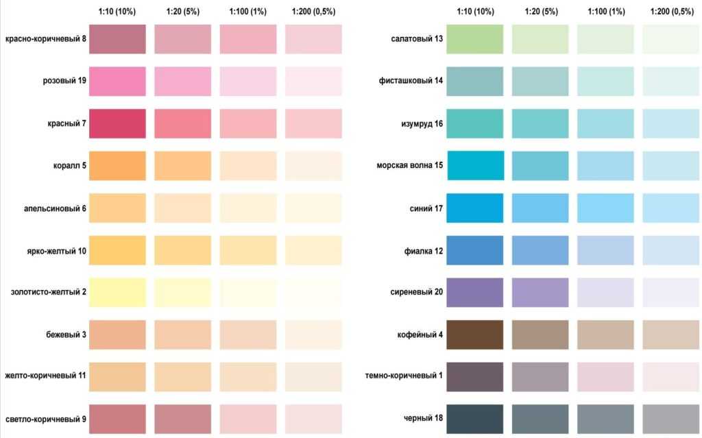Самое сложное – создавать желаемый оттенок самостоятельно на основе белого цвета с помощью базовых колеров. При подборе краски можно воспользоваться таблицей смешения цветов и методом проб добиваться желаемого результата.