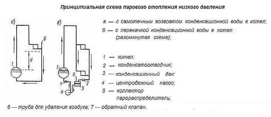 Схемы открытой и закрытой системы парового отопления