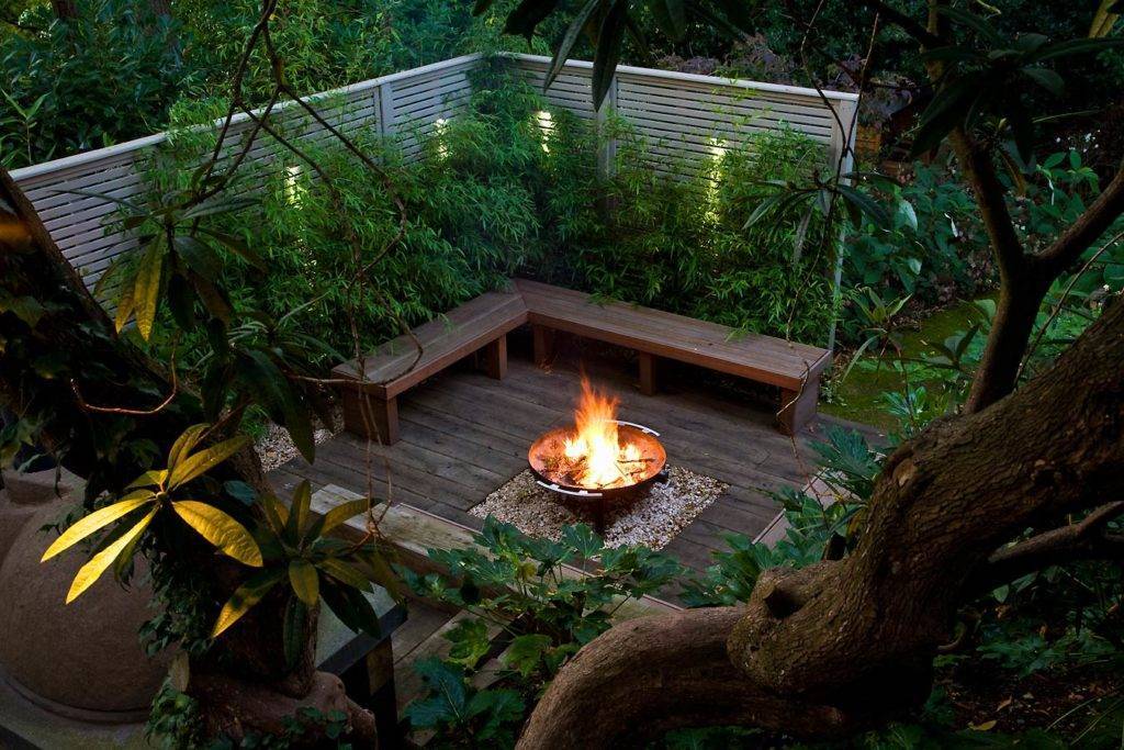 Очень интересно выглядит патио с очагом по центру. Его выкладывают из камня, огнеупорного кирпича в форме чаши. Дешевле будет взять переносную костровую чашу.