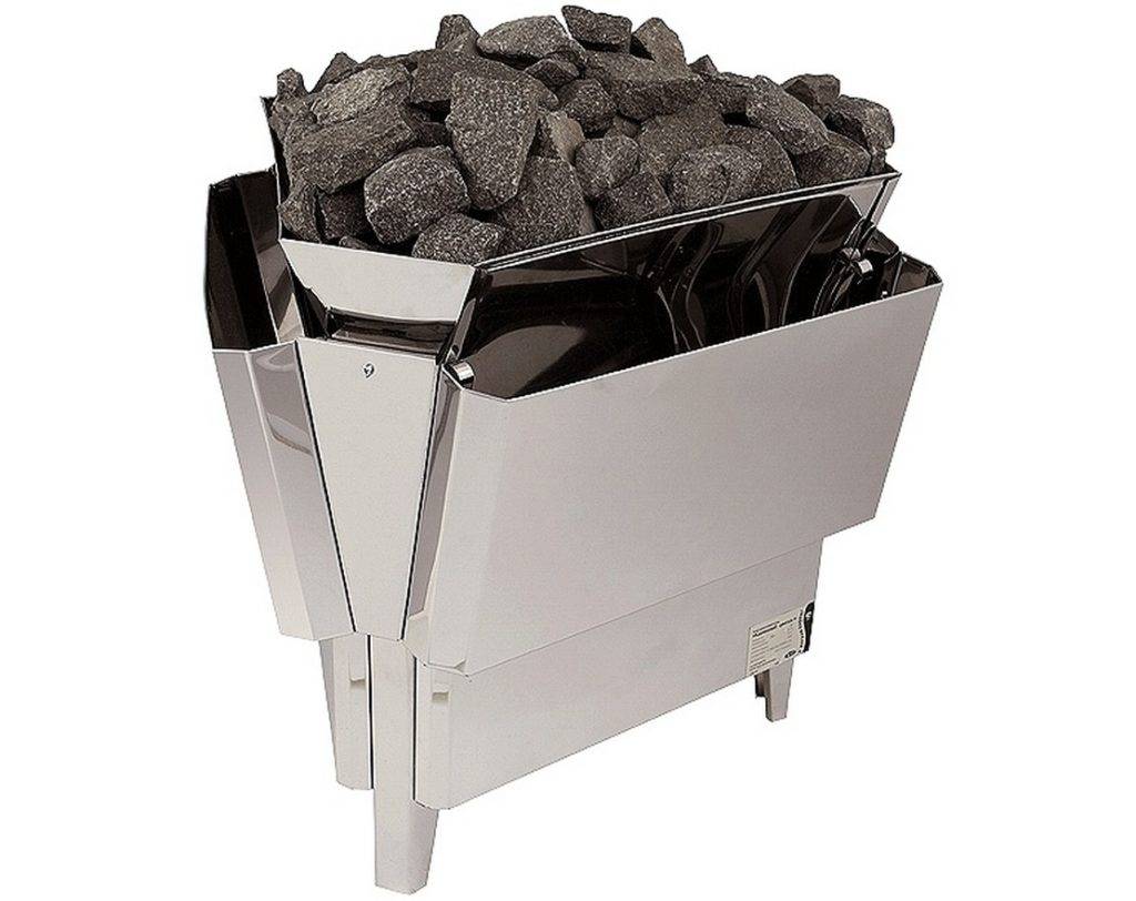 Если у вас сравнительно большая сауна или баня, но вы не готовы покупать печь за несколько сотен тысяч, то данный агрегат решит вашу проблему. Это самая дешевая печь при своих характеристиках. Ее ценник – всего 45 тысяч рублей, а отапливаемый объем – 22 кубометра. Потребляет устройство 14 киловатт, что также является хорошим результатом. Подключение только двухфазное, а в камеру помещается до 70 килограмм природных камней. Конструкция стальная, но передняя стенка также отделана камнем. Правда, искусственным, но и он показывает хорошую теплоотдачу и позволяет печи дольше сохранять тепло в выключенном режиме, что положительно сказывается на экономичности потребления.