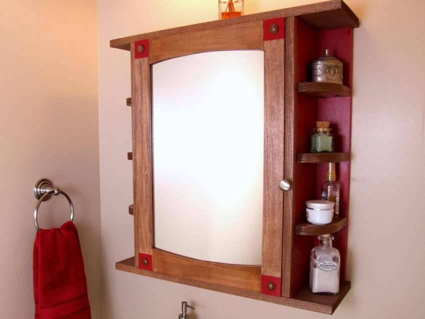 Самый простой вариант – подвесной, причем, если боковые стенки будут узкими, их можно сделать своими руками даже из обычных обрезных струганных досок. Также для этой цели подойдут МДФ и ДВП, эти материалы достаточно плотные, есть и специальные влагостойкие панели. Однако нелишне заранее приобрести пропитку для древесины, которая заполнит поры и станет дополнительным фактором, чтобы шкафчик был надежным.