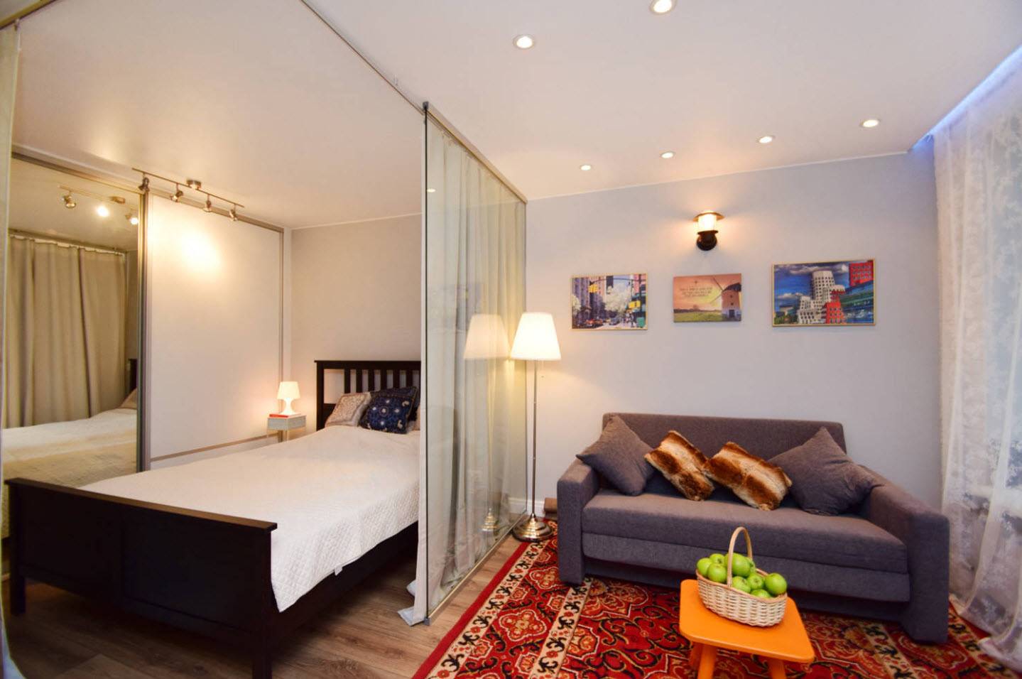 Еще один пример того, как можно угловую однокомнатную «хрущебу» превратить в квартиру студию с выделенной спальней. В спальне, конечно никаких лишних предметов быть не может, только кровать и шкаф. Зато она изолирована.