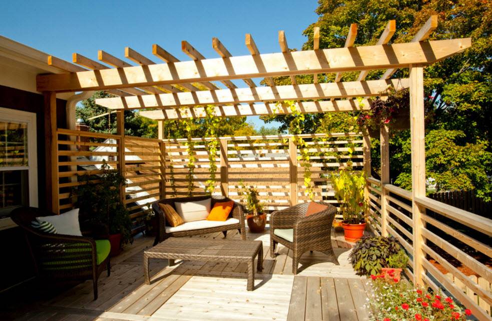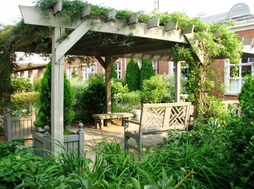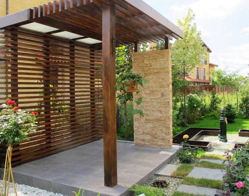 Второй вариант является весьма оригинальным и представляет собой часть домовладения или подобие веранды, на которой вместо крыши используется пергола, стены имеют вид колонн и решеток. При выборе типа нужно правильно определиться с размерами. Слишком большие и громоздкие сооружения на небольших участках выглядят нелепо. Неправильный выбор высоты создаёт недостаточное количество тени, а маленькие конструкции редко выдерживают вес крупных вьющихся растений.