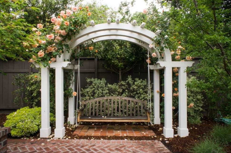 Зачастую арки на садовых участках комбинируют с другими более функциональными деталями, такими как: