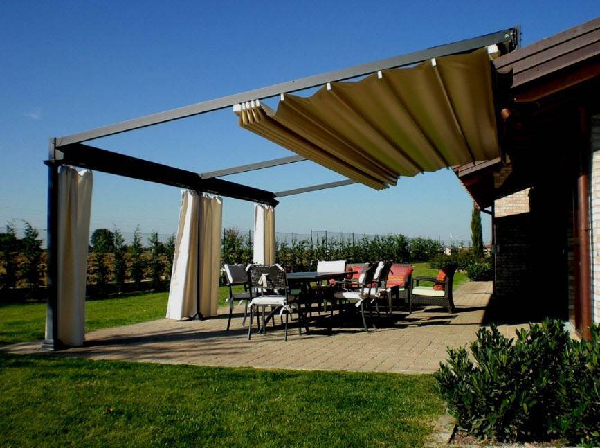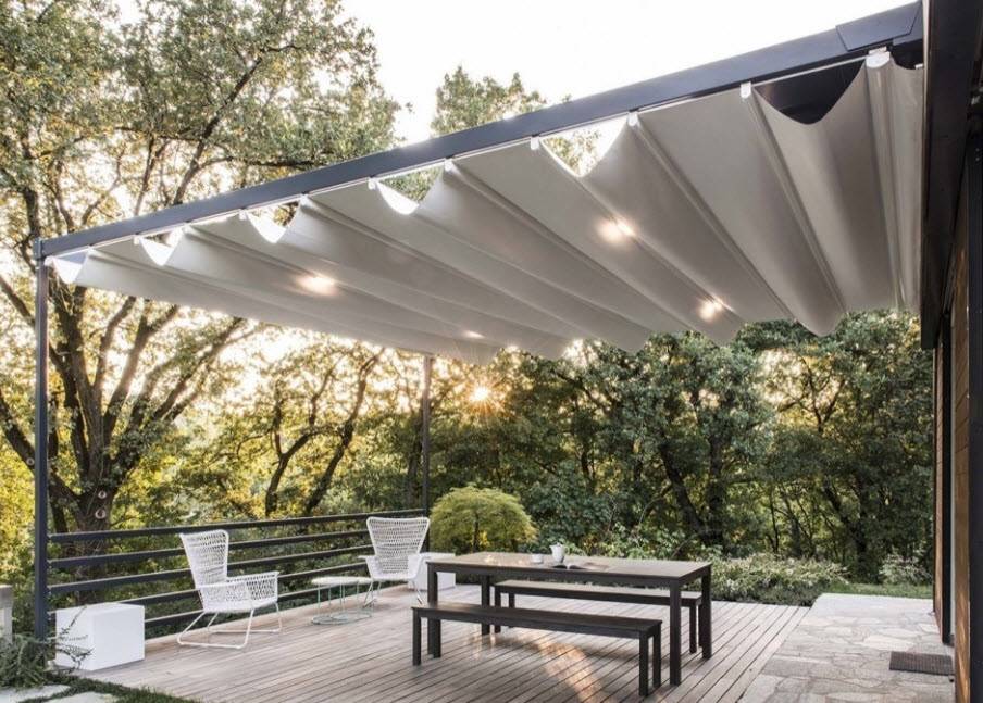 Также прослеживается необычность формы. Допустимы электрические маркизы. Перголу располагают недалеко от дома либо пристраивают к одной из стен.