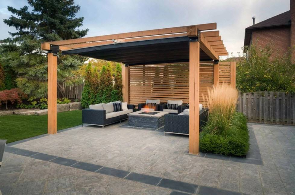 Комфорт и функциональность ‒ черты современного стиля. Навес оснащен автоматической сборной маркизой. Для освещения используются лампы, закрепленные на опорных балках крыши. Дополнительный источник ‒ светильники на боковых столбах. Пол делается на небольшой возвышенности, чтобы во время дождя под навесом не скапливалась вода. Ограничений в материалах, формах, цветах нет. Главное – стильное и гармоничное сочетание.