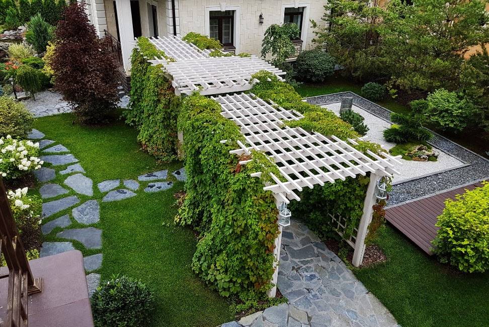 Являясь элементом оформления ландшафта, пергола должна сочетаться с общим видом всего участка, в т.ч. с архитектурой дома.