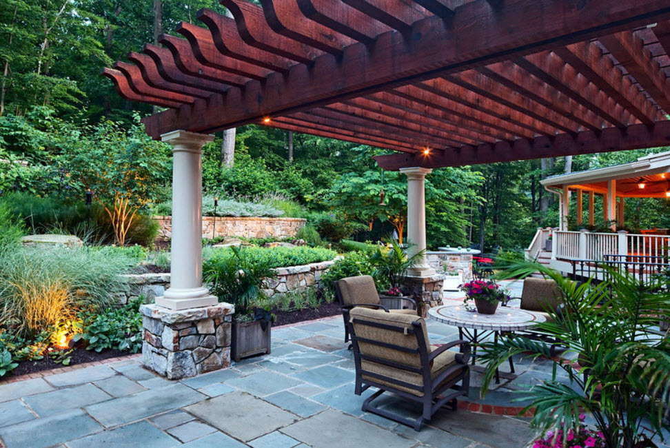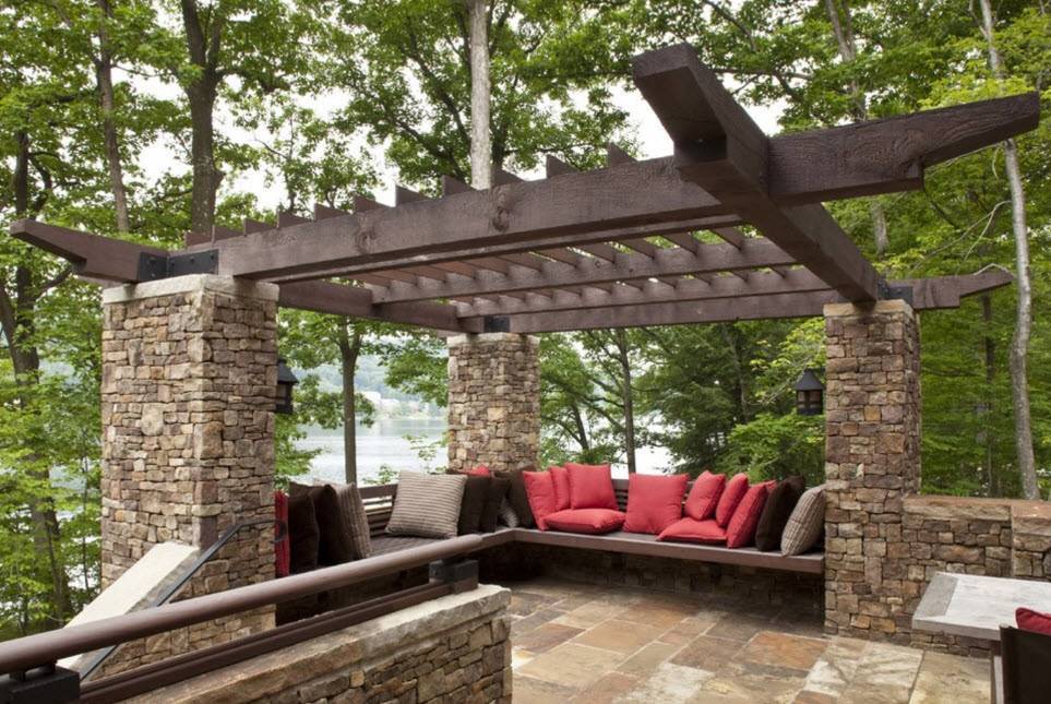 На фото выше пример простой перголы в стиле шале. Грубое дерево без отделки. Пол выстелен натуральным камнем. Конструкция находится на возвышенности, открывая отличный вид на окружающую природу.
