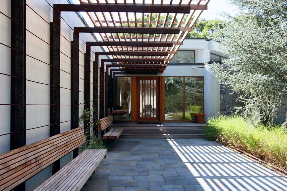 Козырек – популярный вид перголы в южных теплых районах. Устанавливается для затенения окон, выходящих на юг. Снижая тепловую нагрузку с южной стороны дома, стал широко использоваться в энергосберегающих домах, экономя на работе кондиционера.