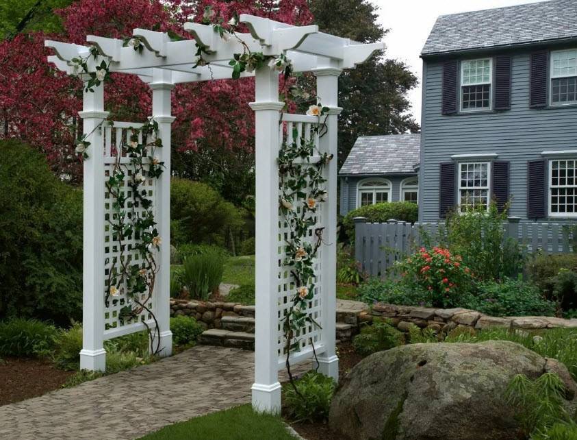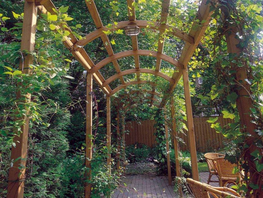 Для поддержки вьющихся растений обычно используются решетчатые конструкции арок, называемые шпалерами. Объемные постройки с повторяющимися элементами называют перголами (арками).