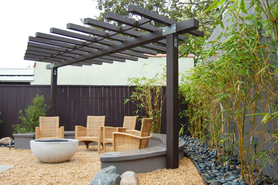 Применимо к перголе чаще встречается при отделке летних площадок кафе, ресторанов. В строгом стиле больше преобладают серый, коричневый, черный цвет. Возможны контрастные сочетания.