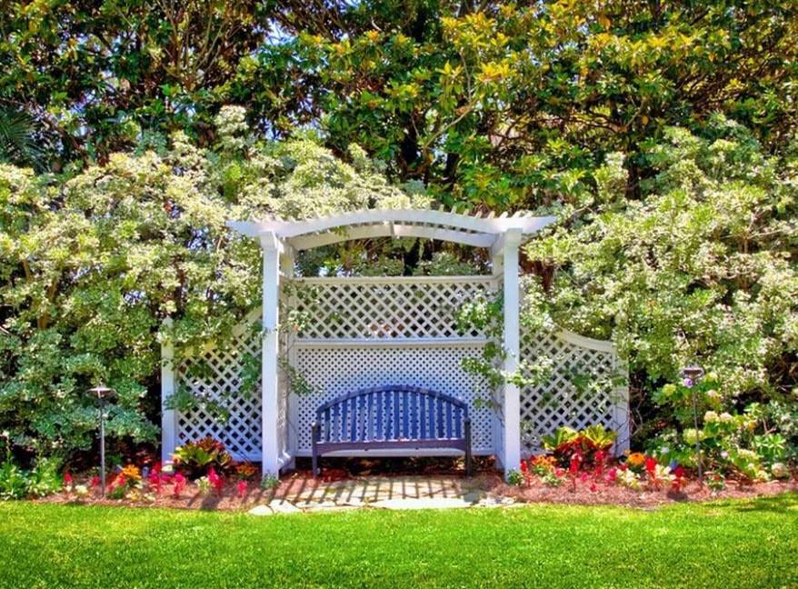 При помощи арки можно условно отделить одну часть садового участка от другой, например сад от огорода, или обособить зону отдыха. А если оснастить арку скамейкой, то получится отличное место для отдыха. Соединенные между собой решетки называют трельяжем, который также можно увить растениями.