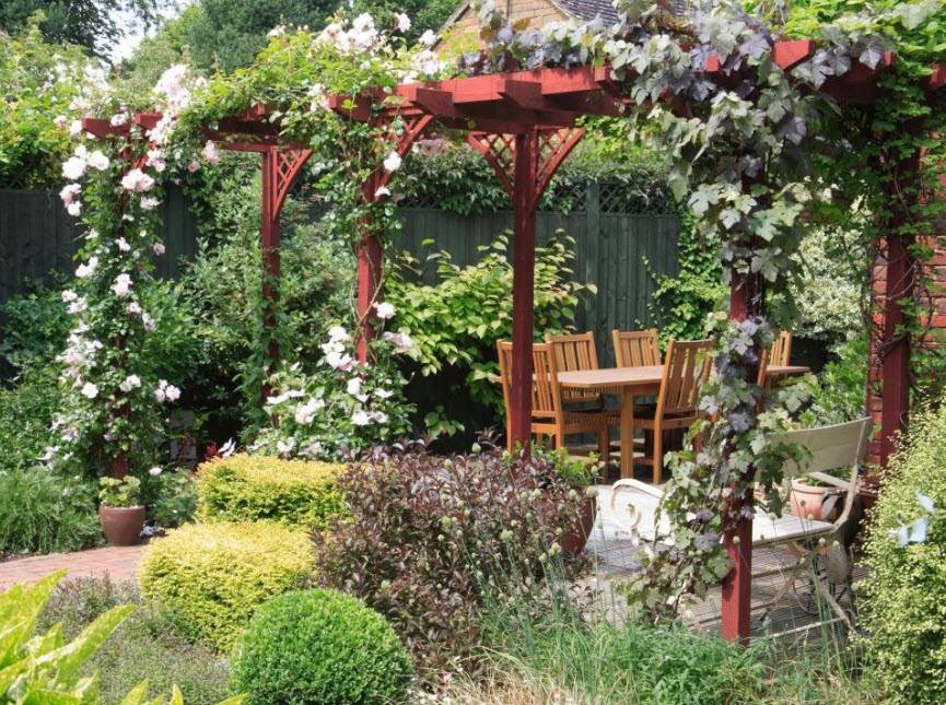 - чрезвычайно элегантное решение – сочетание деревянной беседки с вьющимися розами с длительным цветением; розы также не требуют больших затрат времени, просты в уходе.