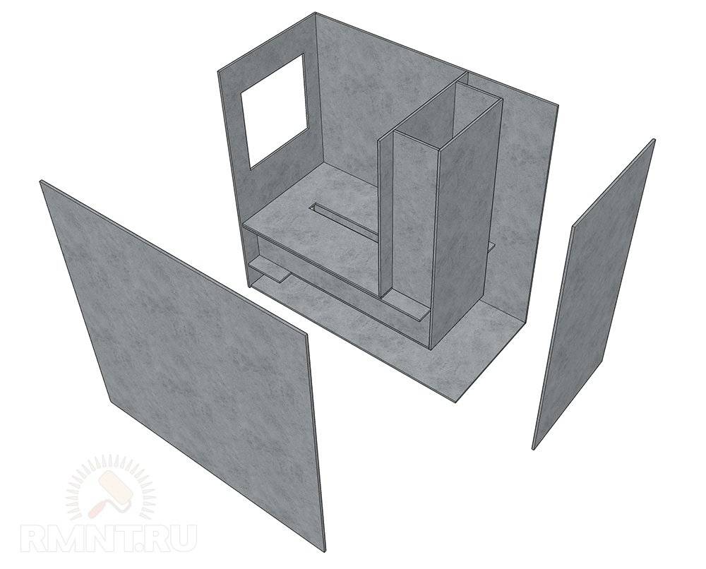 Внутренние стенки рубашки выполняются по краю проточных каналов, имеют высоту камеры сгорания и примыкают вплотную к передней панели. Сверху их накрывают двумя полосами шириной по 100 мм.