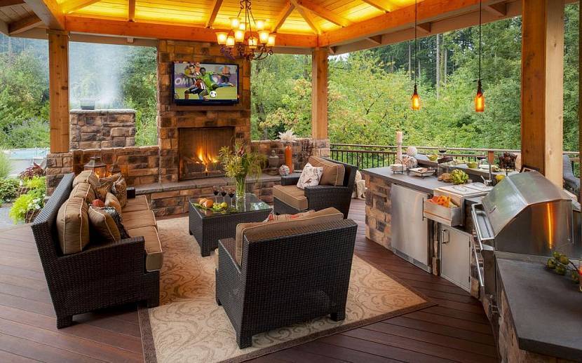 Беседка может стать многофункциональным объектом, вмещающим летнюю кухню и компактный банкетный зал для приема гостей.