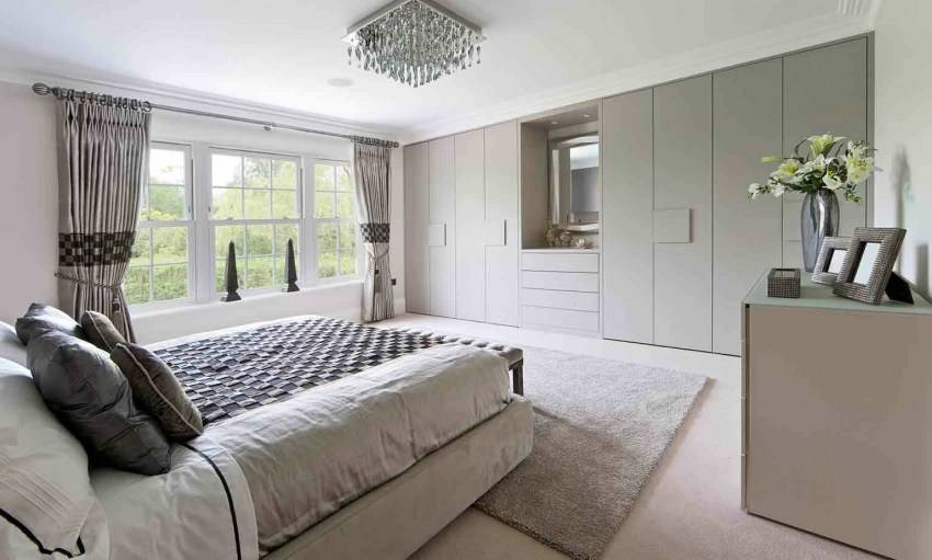Место для гардеробной стоит выбирать после установки кровати. Если комната продолговатая, то уместно поставить конструкцию, например, угловую, у более узкой стены. Популярный вариант — установка гардеробной вдоль перегородки. Чаще всего для этих целей отдается площадь с одной стороны двери или по обе стороны от входа в помещение.