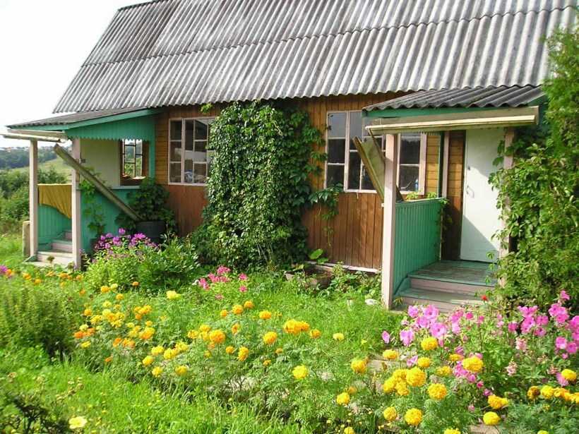 Такое месторасположение приемлемо и имеет множества преимуществ. Во-первых, ваш дачный домик будет выглядеть привлекательно в цветочном саду, а сам участок преобразиться и уже не будет напоминать место для работы. Во-вторых, вам самим будет легче и приятнее отдыхать на территории с цветочной клумбой, нежели смотреть на грядки со спелыми овощами и норовить оборвать сорняк.