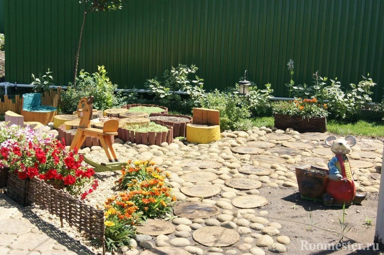 Остальное пространство наполняют цветниками, альпинариями, деревьями. Подойдут различные декоративные фигурки, можно даже самостоятельно изготовить их из подручных материалов.