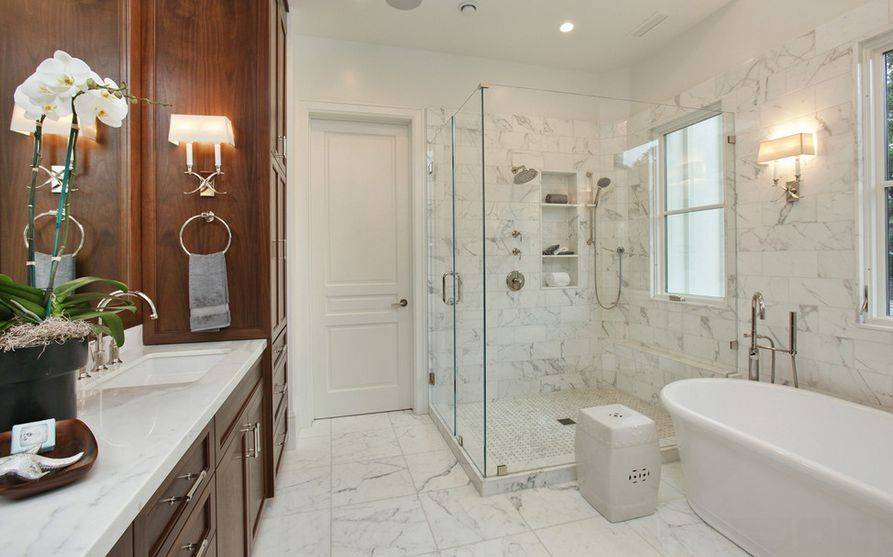 В корпусе ванны — современное решение для большой комнаты с отдельно стоящей чашей для купания позволит вам применять сантехнику в качестве места, где можно разместить шампунь, гель для купания.
