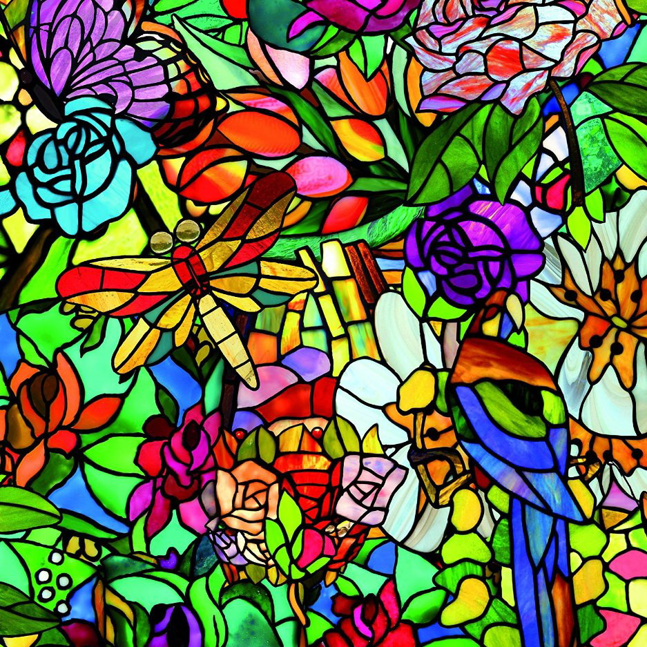 Толщина пленки составляет 75 микрон, а ее прозрачность зависит не только от окраски, но и от прозрачности стеклянной основы. Наклеивать ее рекомендуется при плюсовой температуре от +5С, чтобы покрытие максимально прочно пристало к поверхности. К слову, пленка отлично держится не только на обычном, но также на акриловом или закаленном стекле. Особенностью витражного рисунка на такой пленке является наличие свинцовых прожилок различной ширины и цвета. Благодаря им рисунок приобретает выраженную декоративность и усиленную прочность.