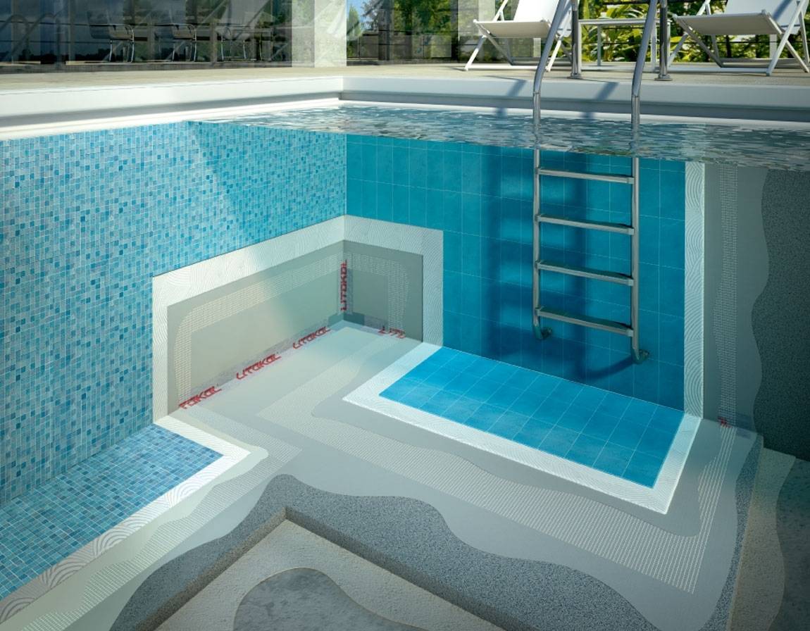 Еще одно важное требование: к выбранной плитке необходимо подобрать подходящий клей. В магазинах вы найдете специальный клей для плитки в бассейн: например, IVSIL AQUA, UNIS и Победит Бассейн