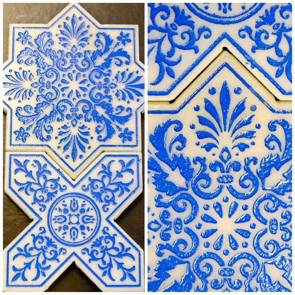 Метлах — это пазл, собранный из мелкоформатных керамических кусочков разной формы. Фрагменты стыкуются на усмотрение дизайнера, количество возможных узоров, как в калейдоскопе — неограниченно. Метлах окрашивается до обжига, что придает ему более естественный, природный оттенок.