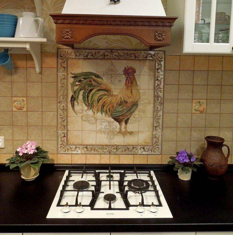 Если дизайн кухни соответствует прованскому стилю, то на стене стоит выложить изображения подсолнухов, петухов или других домашних животных.