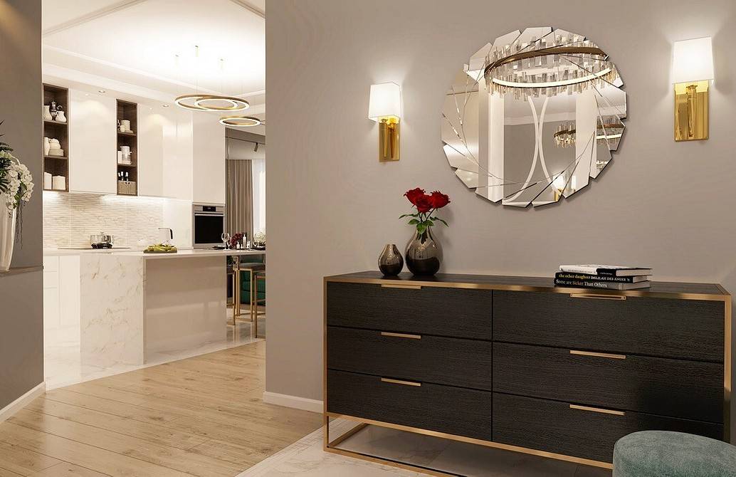 В маленькие комнаты подойдут компактные модульные шкафы. Многие производители мебели предлагают узкие варианты шкафов, комодов, консольных столиков. Зеркальный фасад — отличная идея для визуального расширения пространства.