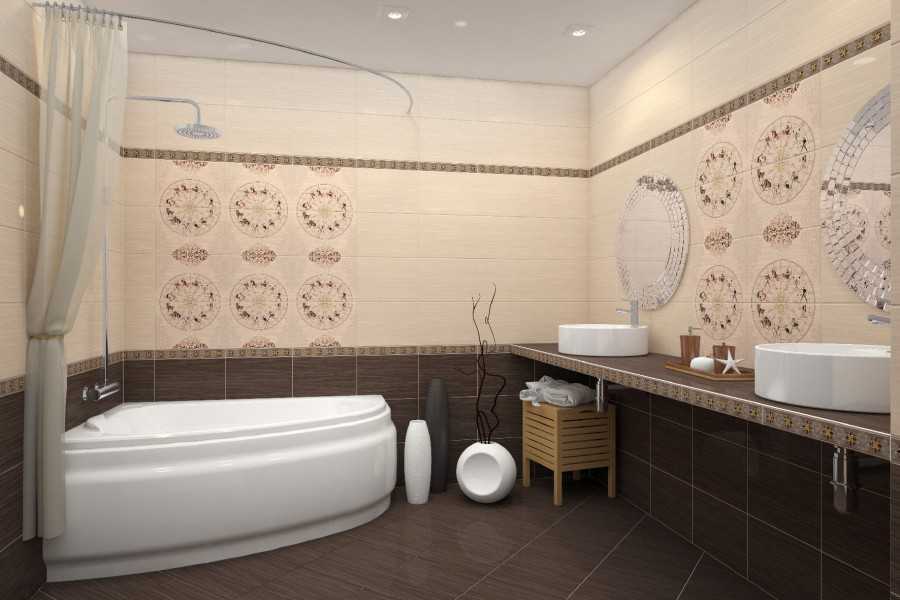 Для ванной подходит коричневый цвет любого оттенка, выполненный под натуральный камень, дерево. Хорошо смотрятся песочные оттенки, с их помощью создайте целое панно возле раковины или душевой. Сочетается с лавандовым, лазурным, розовым.