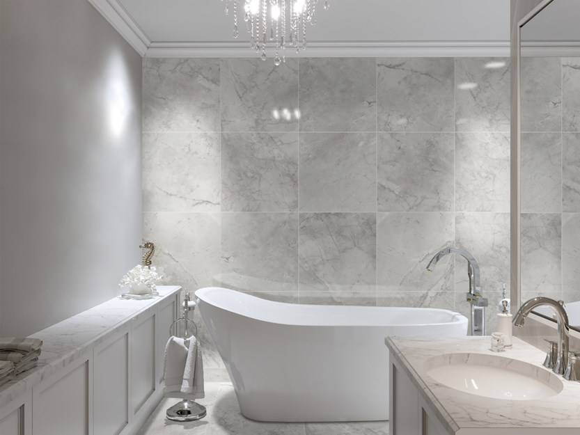 Что касается выбора оптимального размера, чем больше будет облицовочная плитка для ванной комнаты, тем лучше, но это должно быть в разумных пределах. Представьте, как будет выглядеть 90-сантиметровая плитка для маленькой ванной комнаты шириной 160 см. К тому же вы не сможете сделать корректно скрытый люк из-за того, что он должен быть установлен под полной плиткой, к нему нужно будет как-то крепить эту громадину и открывать её.