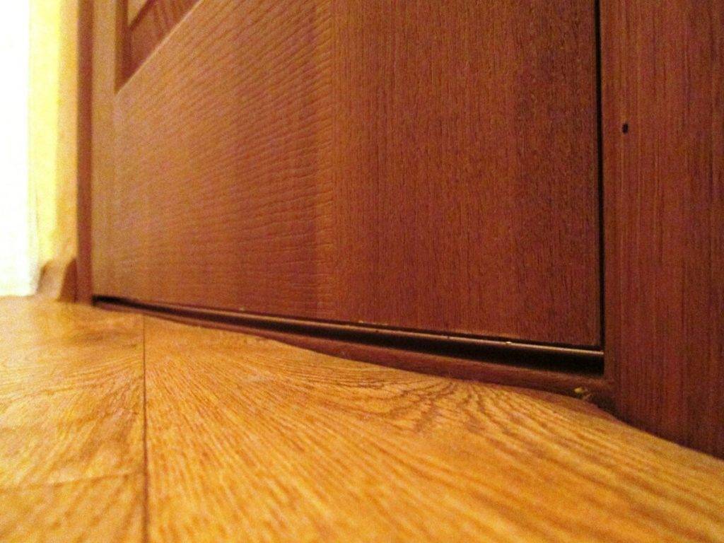 - В случае, если вместо жёстких материалов предусматривается применение коврового покрытия, то необходимо учесть толщину его ворса, а лучше всего установить металлическую раскладку в месте закрывания полотна двери.
