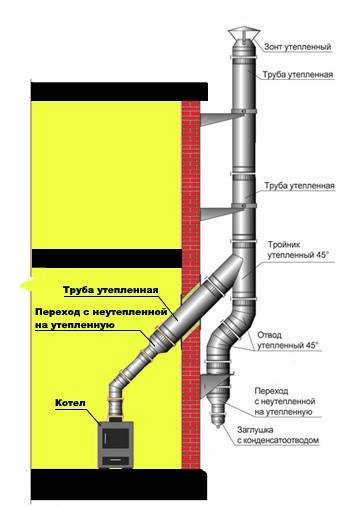 После выхода из стены на трубу надевают тройник. На верх тройника одевается оставшийся дымоход. Высота дымохода для обеспечения хорошей тяги должна быть порядка пяти-шести метров. Трубы дымохода специальными кронштейнами крепятся к стене. Стандартные сэндвич трубы имеют длины в двадцать пять, пятьдесят и сто сантиметров.