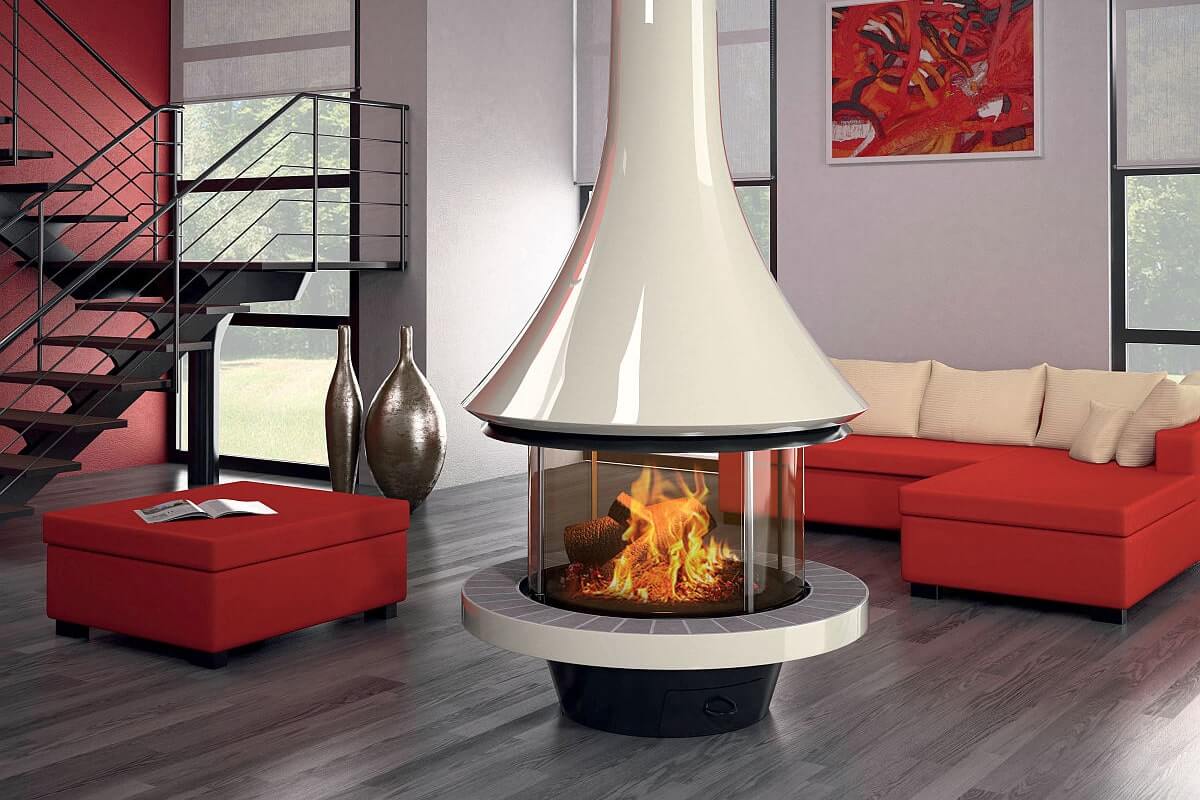 К разновидностям островных каминов относятся подвесные модели, которые не касаются пола. Смотрятся они очень необычно и эффектно. Меньше всего площади требуется угловым каминам. Это самая удобная конструкция.