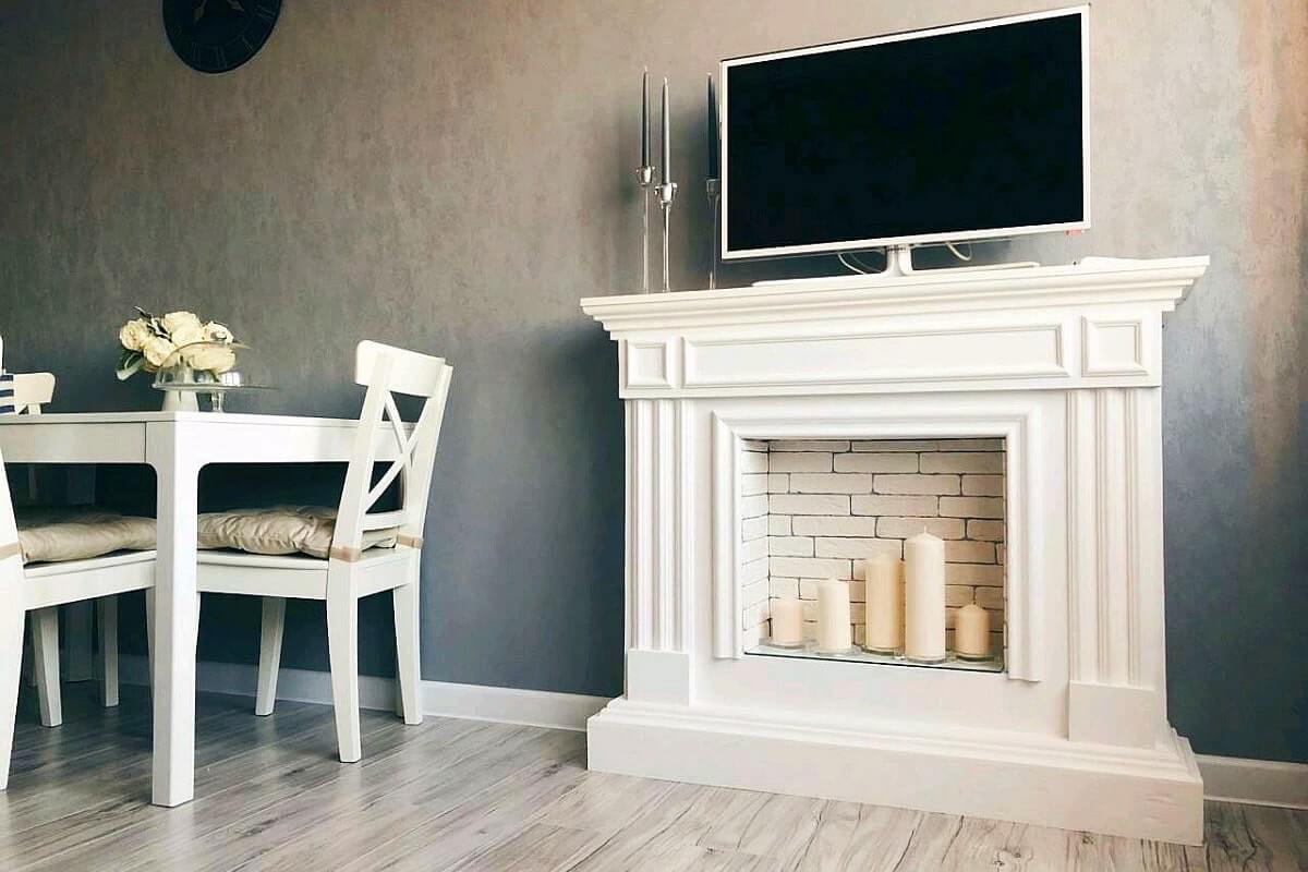 - Если подобрать разную по фактуре плитку и молдинг из полистирола, можно сделать белоснежный камин, и тогда не потребуется краска.