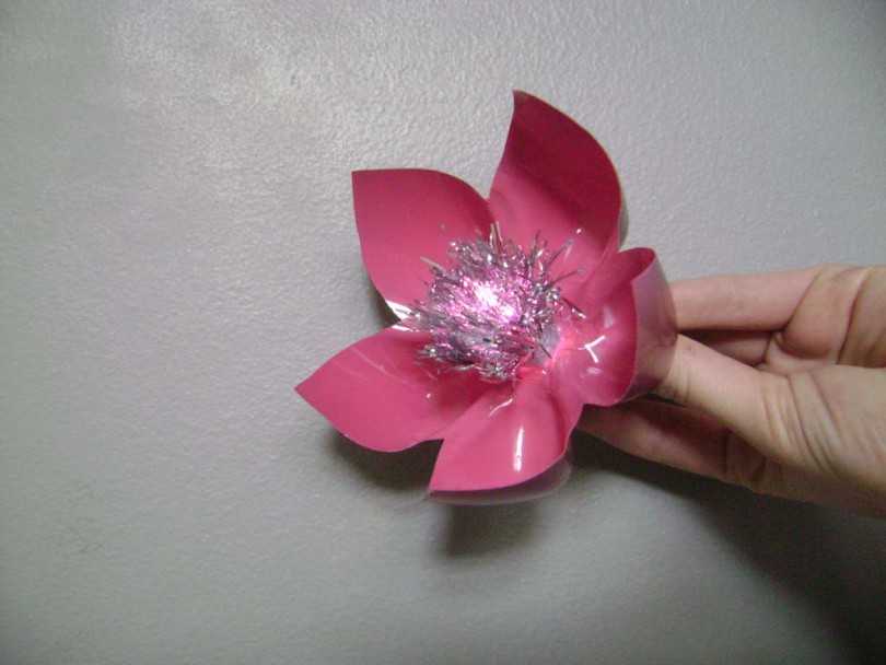 Смастерить цветы из пластика можно по той же технологии, что и бабочек. Используйте разноцветную тару, чтобы поделки получились яркими. Выкройку изделия нарисуйте самостоятельно или возьмите любую схему из журнала, интернета. Чтобы придать форму лепесточкам, аккуратно нагрейте их над пламенем свечи и смоделируйте, пока пластик не застыл. Для склеивания подойдёт горячий клей или прозрачный «Момент». Таким способом делаются любые цветочки – гладиолусы, розы, ромашки и даже фантазийные.
