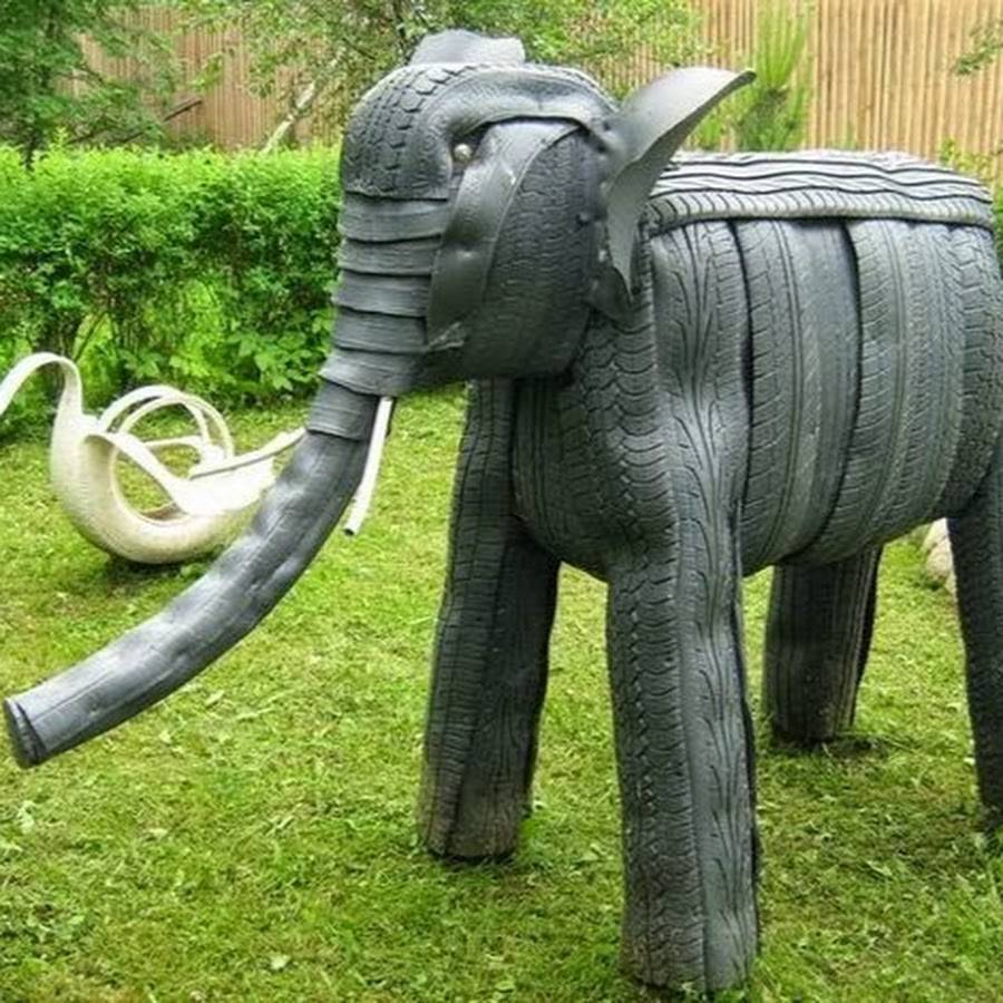 Несложно будет и сделать слона. Хватит даже одной покрышки. Ее половина образует тело, а протектор другой части станет хоботом. Из боковин получатся отличные уши. Для бивней можно использовать посадочные элементы покрышки.