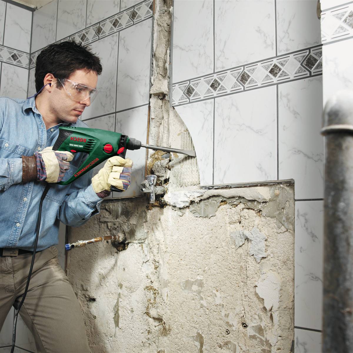 - Если кафель слишком стар или нет необходимости использовать снятую плитку в дальнейшем, то в ход идет радикальный метод удаления облицовки, с использованием перфоратора с насадкой в виде долота.