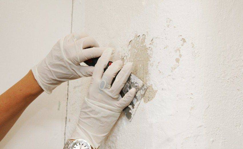 - Перед началом работ нужно «пройтись» шпателем по всей стене, поверхности потолков и удалить «островки» легко снимающейся покраски.