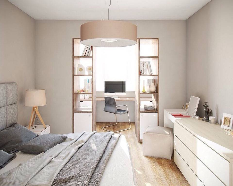 Если совместить комнату с лоджией, то в спальне можно устроить практически изолированный рабочий кабинет. Для зонирования используйте легкие перегородки или стеллажи.