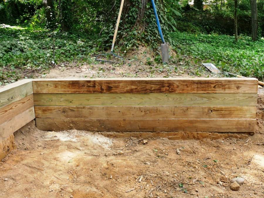 - если планируемая высота террасы составляет 0,4 – 0,8 м, нижняя часть стены, являющаяся фундаментом, заглубляется на 0,15 – 0,3 м.